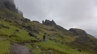 It rained all night, but luckily it subsided by the next morning. We started out at 8.30am to hike the Quiraing, a landslip of the Trotternish Ridge (from Wikipedia). We drove through the single track road after Uig, passing rolling hills, farms and flocks of sheep. The parking cost GBP 3 for 3 hours. We hiked for about 1.5 hours, we didn't complete the loop as it was very windy and drizzling.